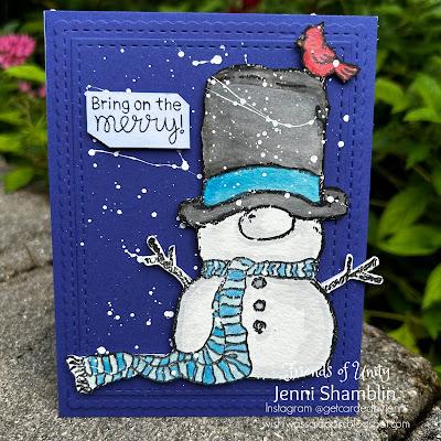 The blue on blue on blue, die cut and splattered with white is what I loved about this one! I stamped the snowman onto watercolor paper with Versafine Clair, colored in with some water and distress watercolor pencils. Fussy cut this cutie out and added some shimmer watercolor, which unfortunately are not really very visible any more! Grabbed the scallop and rectangle nesting dies and used the two largest to die cut those panels. Mounted the snowman and sentiment using foam adhesive to pop up!